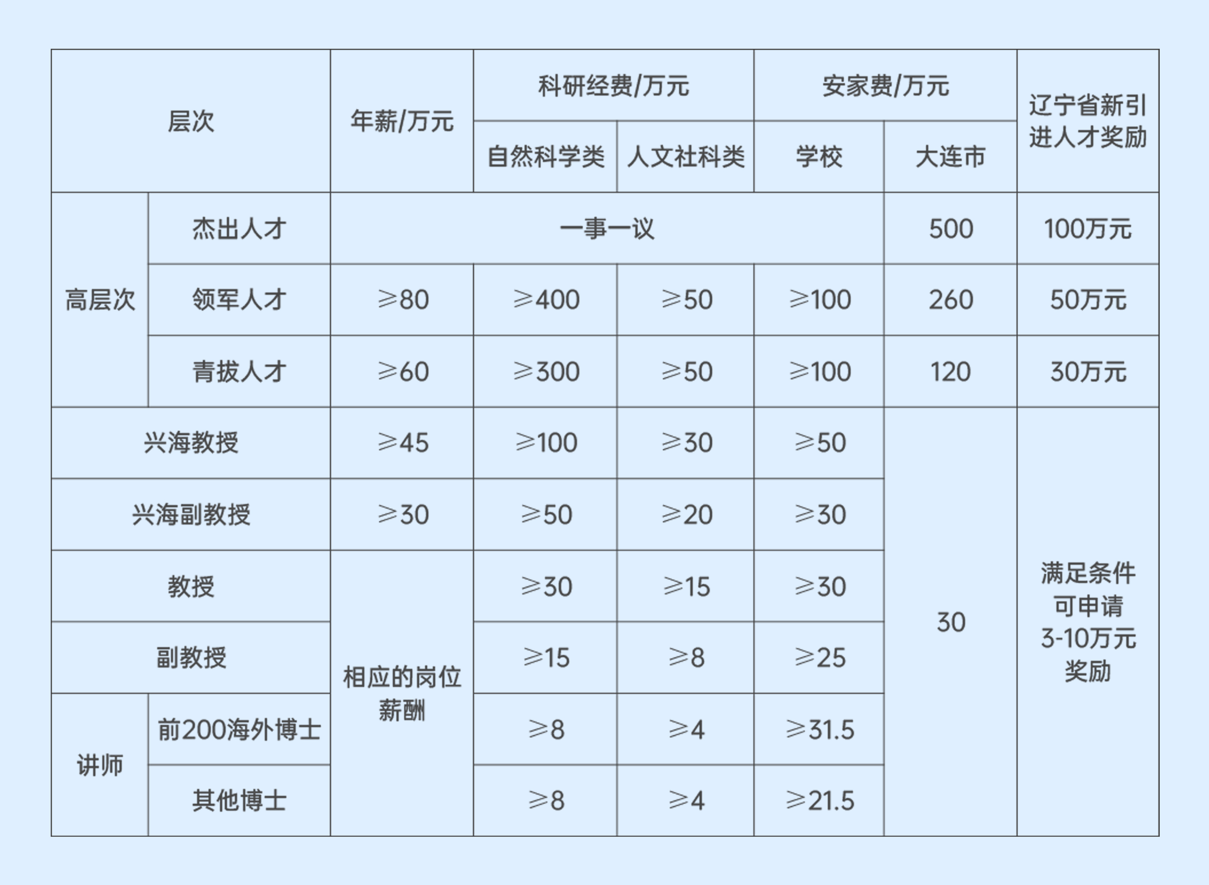 学校安家费≥20万元(一次性发放)、大连市安家费≥30万元、辽宁省安家费3-30万元;提供两室一厅一厨一卫拎包即住的人才周转住房。